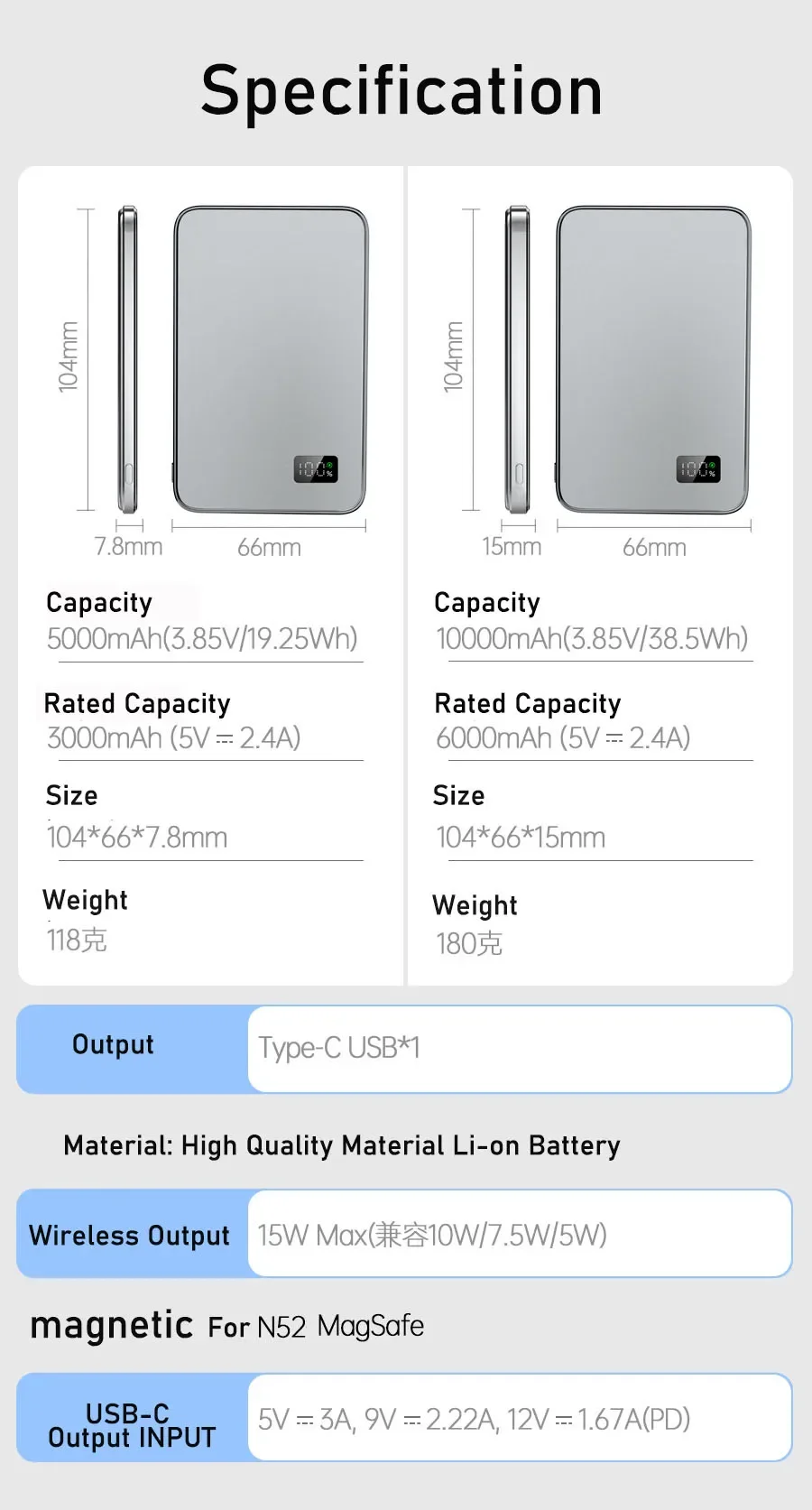 Wireless Magnetic Power Bank 10000mAh External Battery Mini PowerBank with Digital for Magsafe IPhone 15 14 13 12 11 Poverbank